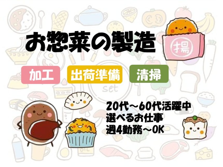 👇下記配属先から選択可能です!! 【⭐お惣菜の加工】 スーパーに並んでいるお惣菜やおせち、恵方巻などの製造。 パック詰め、準備作業がメインです。