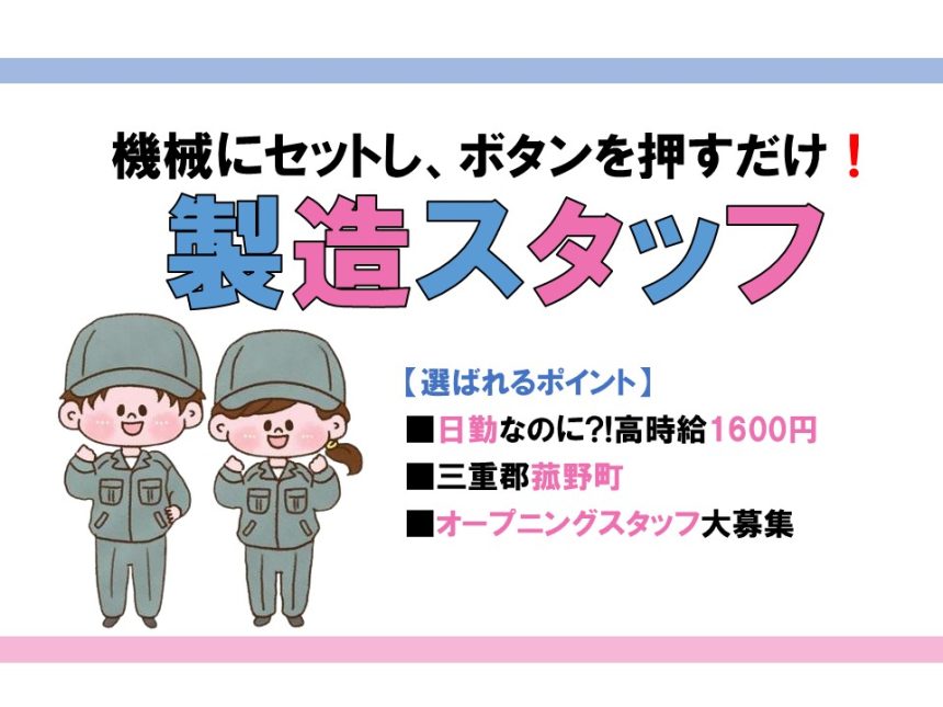 | 業務内容 | <製造スタッフ> 新製品の試作製造のお仕事です。 部品を機械にセットし、ボタンを押し、カメラで傷がないか検査する作業です。 ✅ 必要なスキル 特にありません。 ✅髪色・ネイル・服装 明るい髪色OKです(金、銀はごめんなさい…) 不安な方はまずご相談ください♪ 🌟コツコツ作業が得意な方必見です♪ ✅ 職場環境 冷暖房完備のきれいな事務所です。 基本先輩社員が4~5人常駐しています。 わからないことがあればすぐに聞ける環境です。 オープニングスタッフの為、大募集中です! 20代、30代、40代が大活躍中✨ |