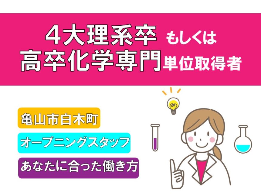 | 求人条件 | リケジョ、4大卒 もしくは高等学校で化学専門の単位を取得している方 |
